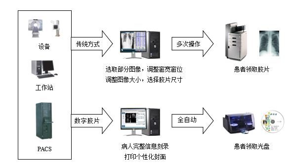 数字胶片(光盘版)是采用光盘这种存储介质来替代传统的物理胶片。通过医院的流程再造,达到提高病患满意度,减少医生工作量,为医院节约成本的目的。